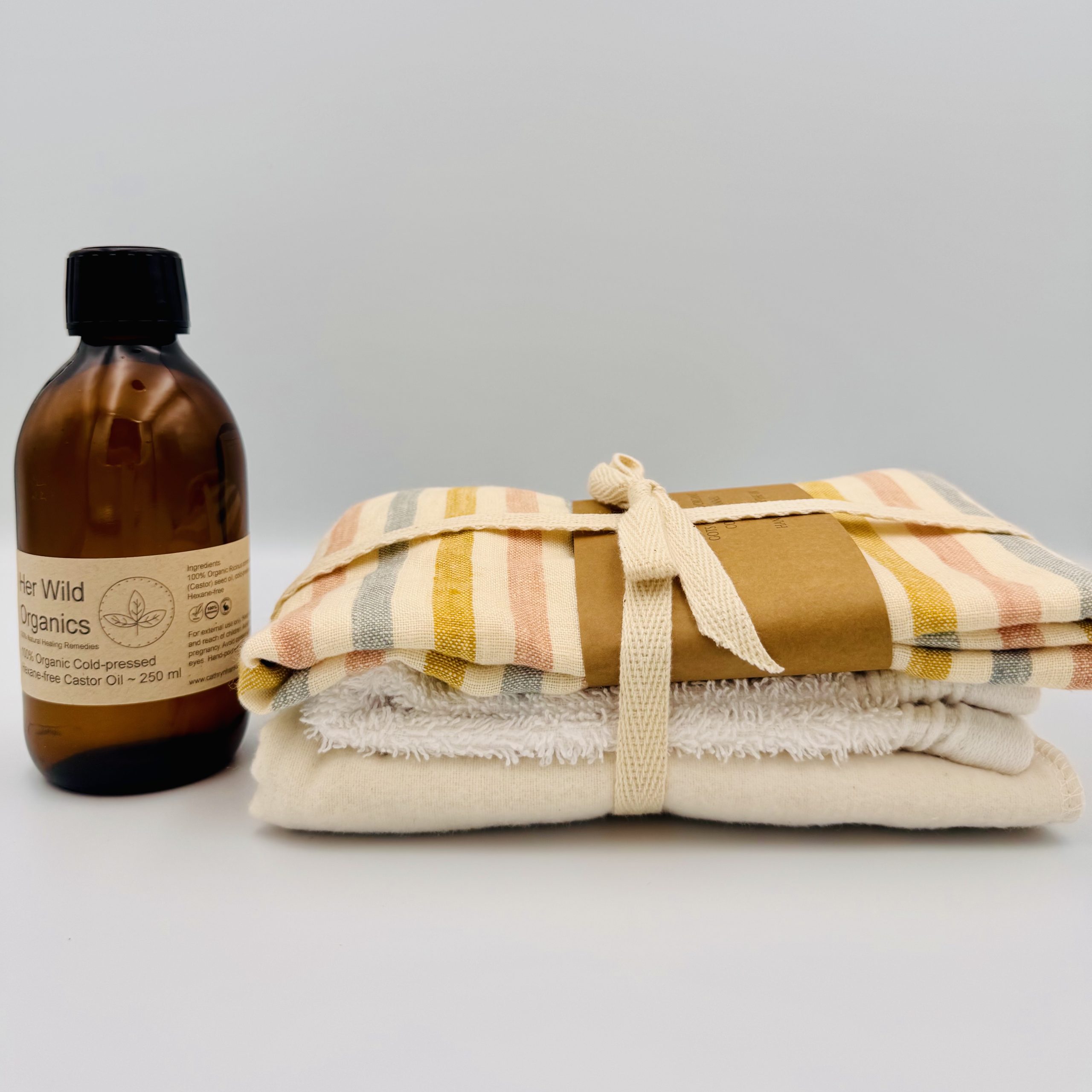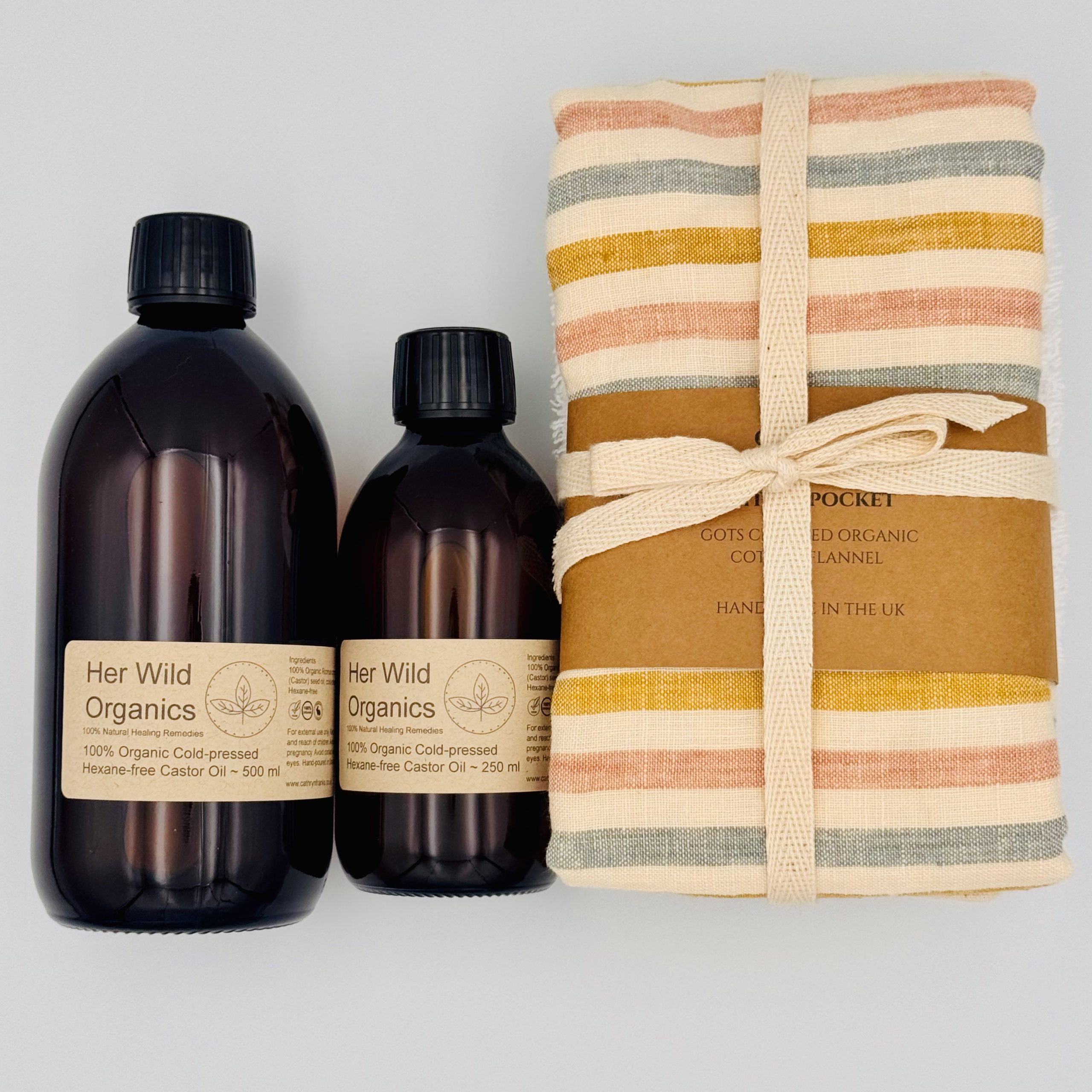 Cold-Pressed Organic Castor Oil Liquid : A 250ml bottle of cold-pressed, hexane-free, organic castor oil can be added as an optional extra with your order.
